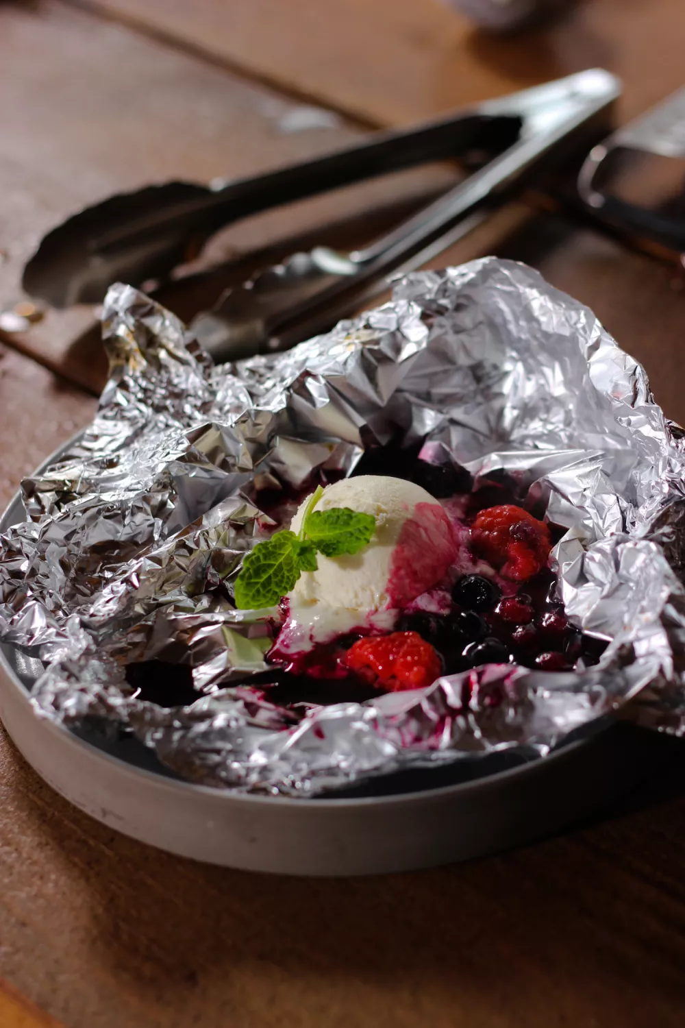 Zomerse papillottes van rood fruit en cuberdons brengen de volle smaak van blauwe bessen, frambozen en rode bessen samen met een fris vleugje limoen. De vruchten worden kort gegaard in kleine pakketjes van zilverpapier op de barbecue zodat het sap karameliseert en de cuberdons zacht smelten. Serveer warm met een bolletje vanilleijs voor een eenvoudig feestelijk dessert bij tuinfeesten of zomerse diners.
