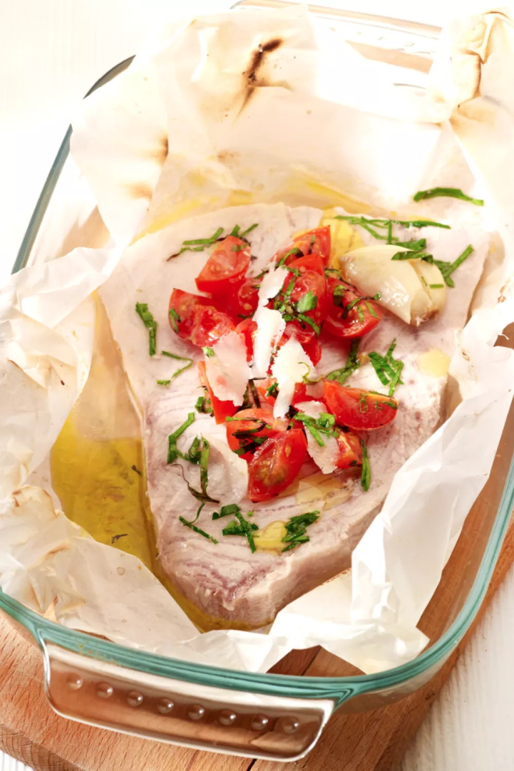 Zachte zwaardvis stoomt in papillot samen met zoete kerstomaatjes, knoflook en pecorinokaas tot een sappig mediterraan hoofdgerecht. Het ovenpakketje met een scheutje witte wijn en verse dille vangt alle aroma's, terwijl een fris rucolaslaatje met balsamico en olijfolie het geheel licht en zomers houdt. Ideaal als snelle doordeweekse maaltijd of als feestelijk visgerecht voor gasten.