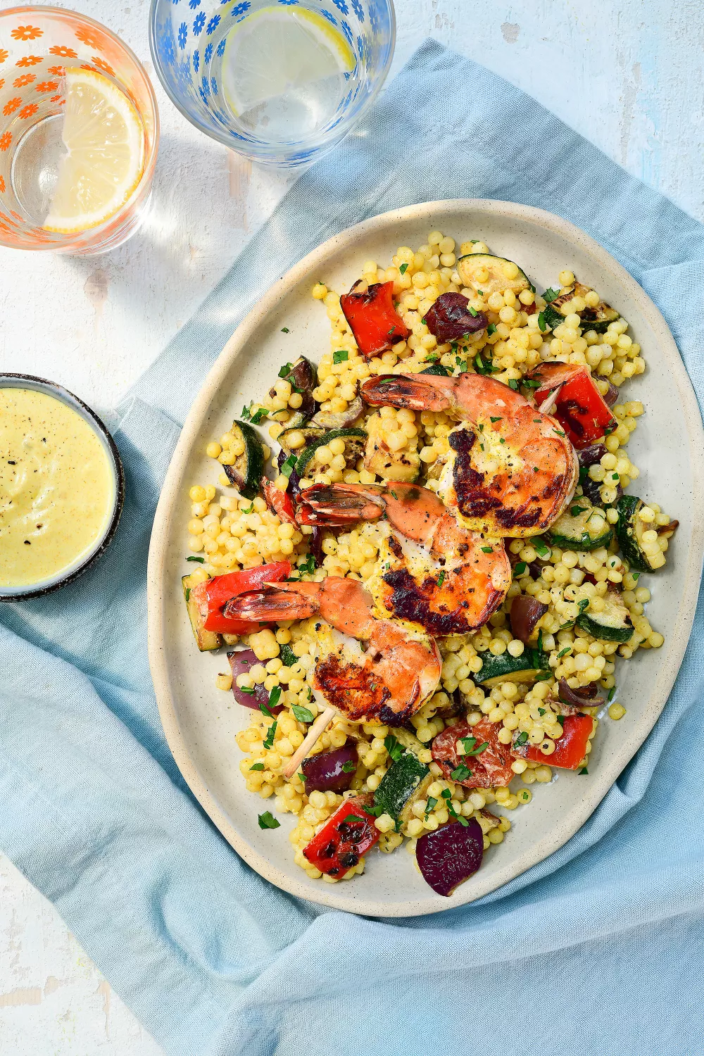 Een lichte, kruidige maaltijd met gegrilde scampi op spiesjes en romige currysaus van Griekse yoghurt, geserveerd met parelcouscous en beetgare courgette, paprika en rode ui. De mix van currypoeder en ras el hanout geeft een warme, aromatische toets die goed past bij zomerse avonden of een snelle doordeweekse maaltijd. Grill de scampi kort in een grillpan en werk af met verse peterselie voor frisheid.