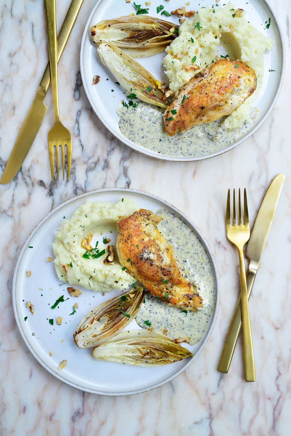 Parelhoen met gegratineerd witloof, truffelsaus en puree