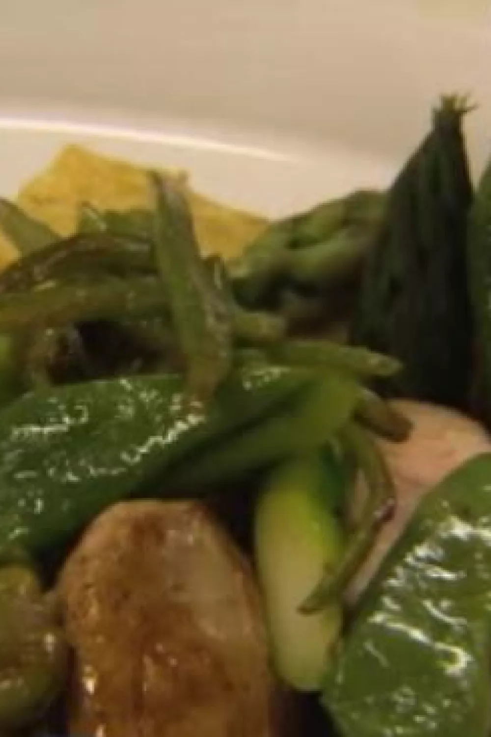 Blancheer ondertussen de asperges in kort in gezouten water en laat afkoelen. Grill net voor het serveren de asperges kort aan. Blancheer ook de tuinbonen, doperwten en snijbonen. Spoel af onder koud stromend water en stoof op in boter met de een gesnipperd sjalotje.