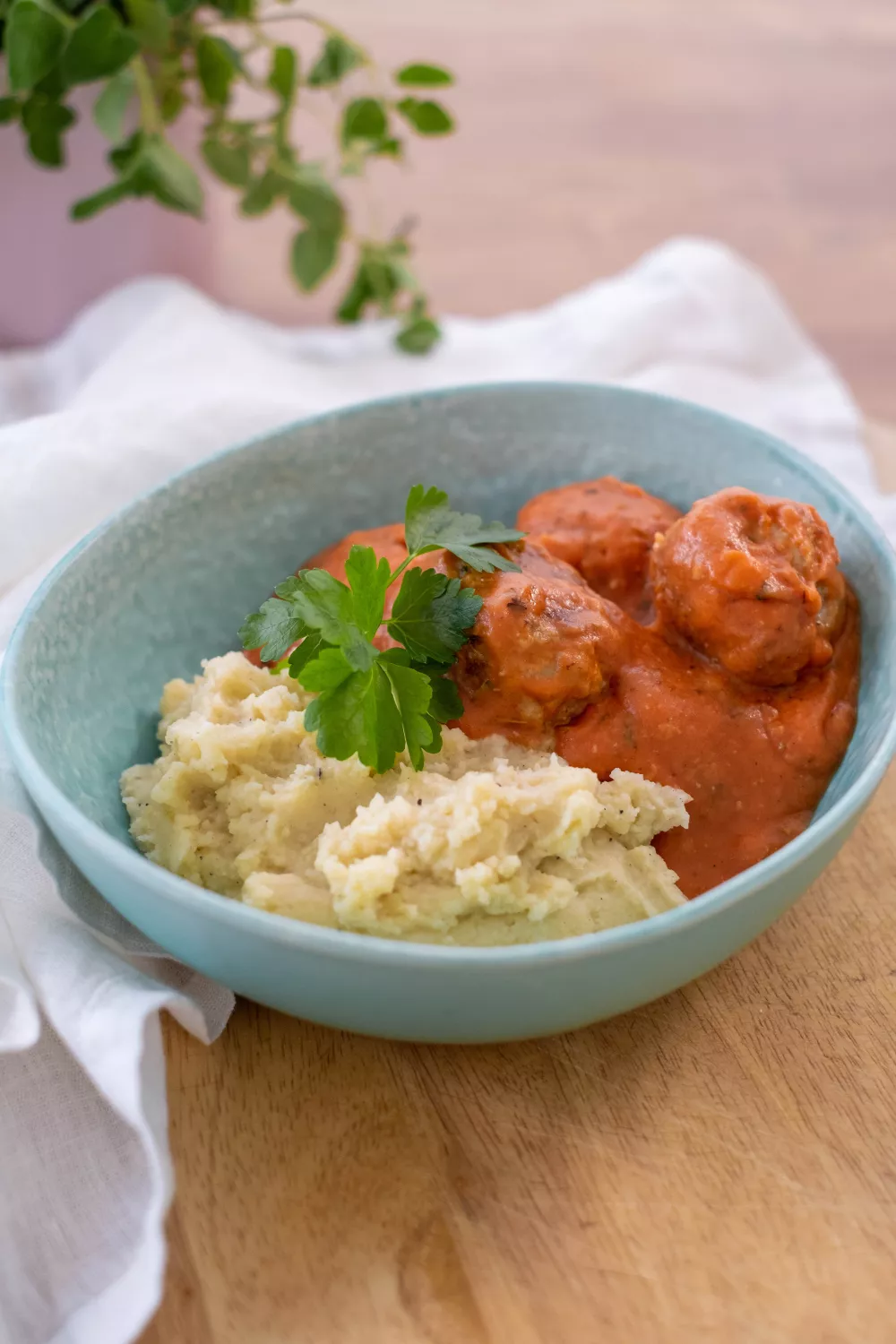 Serveer de balletjes met de tomatensaus en een flinke lepel aardappelpuree.
