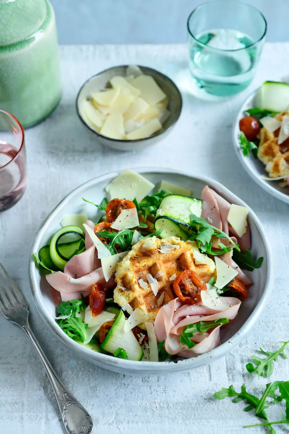 Hartige Parmezaanwafels met mortadella, rucola en gegrilde courgette combineren knapperige, zoute en frisse smaken tot een feestelijk borrelhap of zomerse brunch. Het wafelijzer geeft het beslag met geraspte Parmezaan een goudbruine korst terwijl linten gegrilde courgette en halfgedroogde tomaatjes voor een fris contrast zorgen. Werk af met extra rucola en Parmezaan voor een Italiaanse touch.