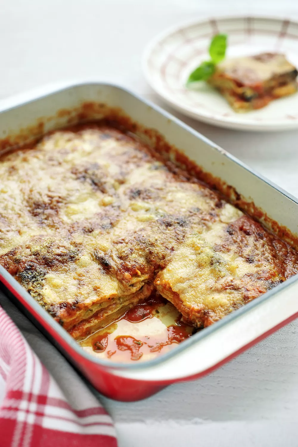 Deze parmigiana met groenten is een mediterraanse ovenschotel van krokant gebakken aubergines, een rijke tomatensaus met Parmezaankorst en een goudbruine laag geraspte Parmezaan. De saus wordt rustig gestoofd met ui, look en basilicum, de aubergines worden gepaneerd en gebakken en daarna in lagen gegratineerd in de oven. Ideaal als smaakvol hoofdgerecht bij zomerse diners of in kleine porties als elegant voorgerecht.