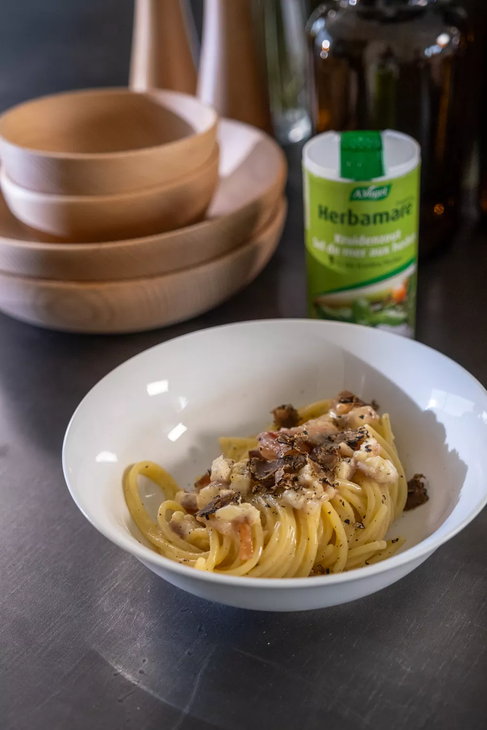 Deze luxe Italiaanse pasta carbonara combineert romige eiersaus met pecorino, knapperige guanciale, gerookte paling en geschaafde truffel voor een intens en verfijnd smaakpalet. Door het hete vet en een scheutje pastawater ontstaat een fluweelachtige emulsie die de spaghetti al dente omhult. Perfect voor een feestelijk diner in herfst en winter of als indrukwekkend weekendgerecht.