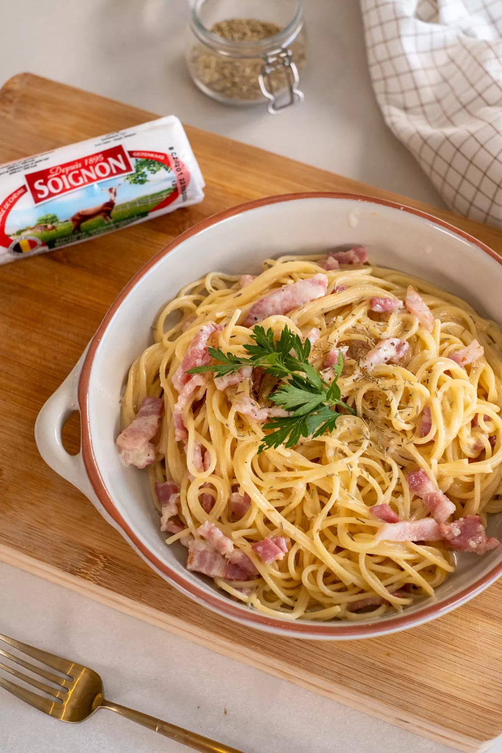 Romige spaghetti met zachte Soignon geitenkaas en krokante spekjes is een snel comfortfoodgerecht voor doordeweekse avonden of een gezellig weekendmaal. De spekjes bak je krokant en de geitenkaas smelt in de room tot een fluweelachtige saus die je door de al dente pasta mengt met honing en gedroogde tijm. Werk af met verse peterselie voor een warme herfst of wintermaaltijd.