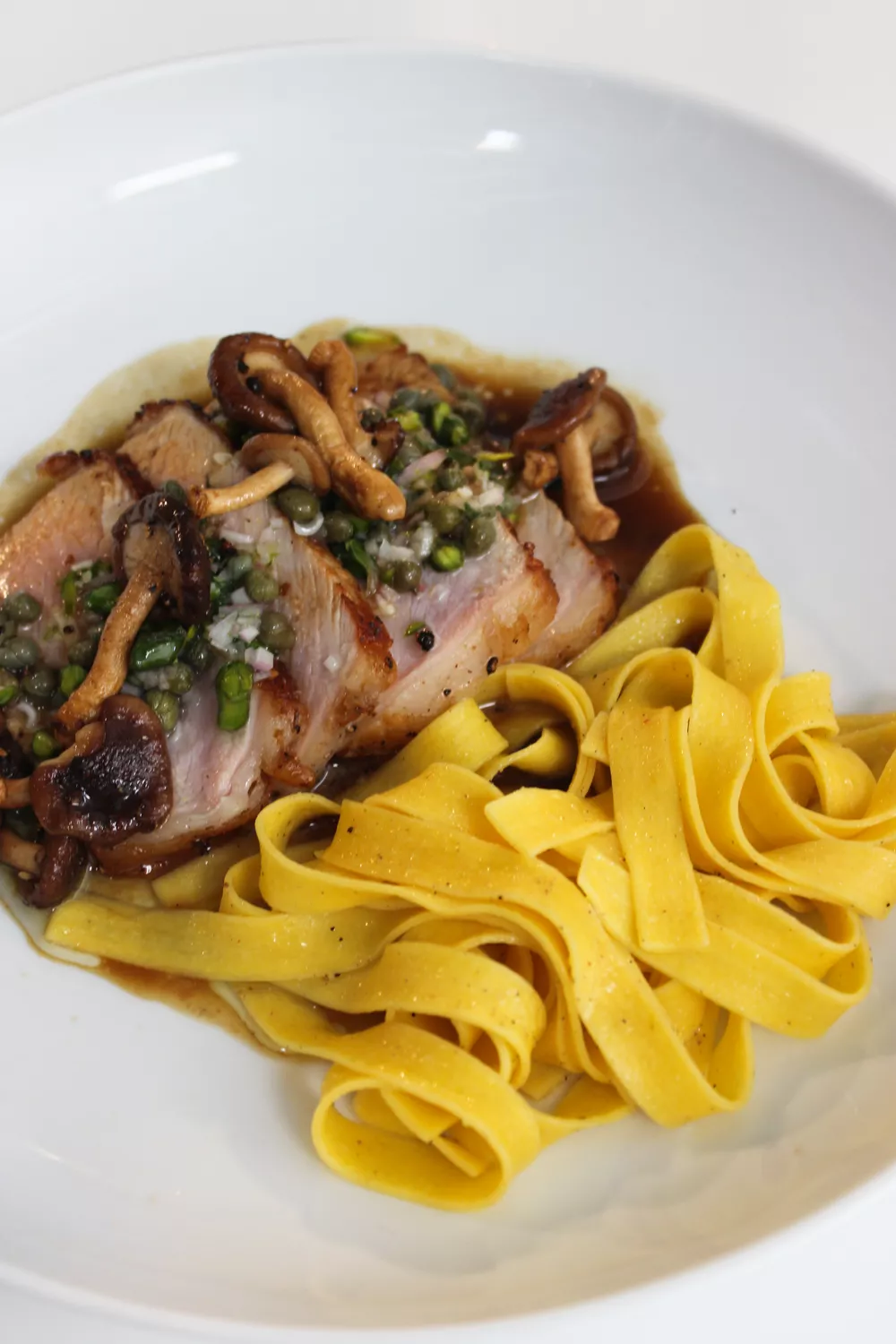 Romige tagliatelle met rosé gebakken kalfsrug, umami shiitakes en een warme madeirajus vormt een feestelijk hoofdgerecht voor herfstige diners. Een frisse salsa van pistachenootjes, kappertjes, citroen en salie zorgt voor knapperigheid en frisheid. Door het vlees rosé te bakken en regelmatig te arrosseren ontwikkel je een rijke jus op basis van madeira en kalfsfond. Perfect voor speciale gelegenheden of een smaakvolle doordeweekse verwennerij.