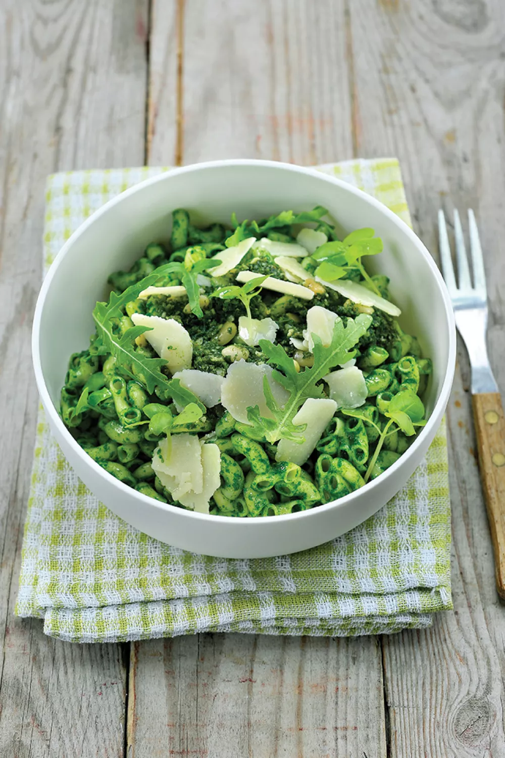 Deze romige pasta met pesto en groene kruiden combineert verse spinazie en basilicum met knoflook en pijnboompitten voor een frisse, hartige smaak. Met een korte blanchering van de spinazie en twee keer blenderwerk maak je zowel een klassieke pesto als een fluweelachtige spinaziecrème om door macaroni of rigatoni te scheppen. Perfect als lichte lente- of doordeweekse maaltijd, afgewerkt met Parmezaanse schilfers, lente-ui en een scheut olijfolie.