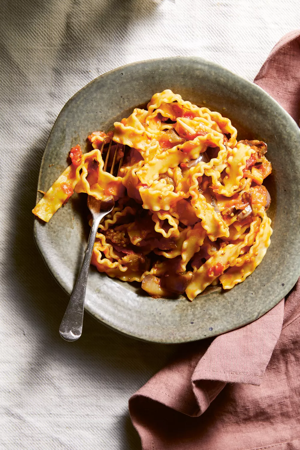 Deze pasta met tomaten saffraansaus, gebakken aubergine en knapperige amandelen combineert zonnige mediterrane smaken met fijn gestampte saffraan en geurige knoflook. Het recept werkt met eenvoudig sauteren en licht frituren voor goudbruin auberginevlees en een ingestokte saus van verse tomaat. Perfect als zomerse vegetarische maaltijd of snelle doordeweekse pasta, geserveerd met goede olijfolie en maltagliata voor extra textuur.