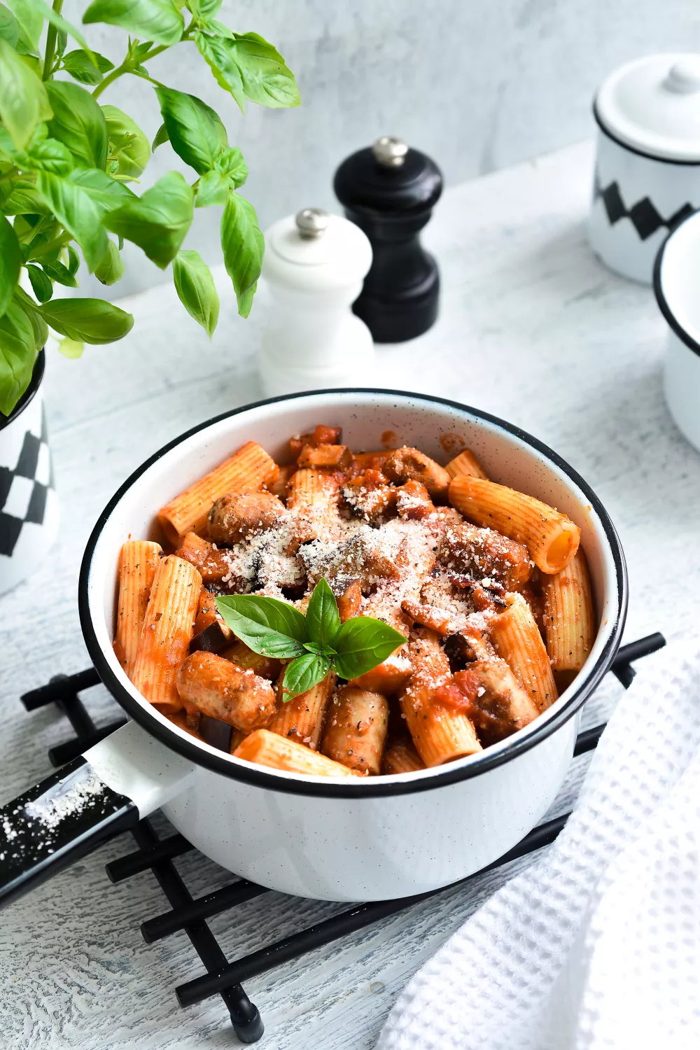 Romige rigatoni met krokant gebakken chipolata worst en zachte blokjes aubergine in een rijke tomatensaus, afgewerkt met Parmezaanse kaas en verse basilicum. De worsten worden gebruind en de aubergine zacht gestoofd, met een scheut rode wijnazijn voor een frisse toets die de tomaten mooi opheft. Snel genoeg voor doordeweekse avonden en hartverwarmend genoeg voor koelere seizoenen.