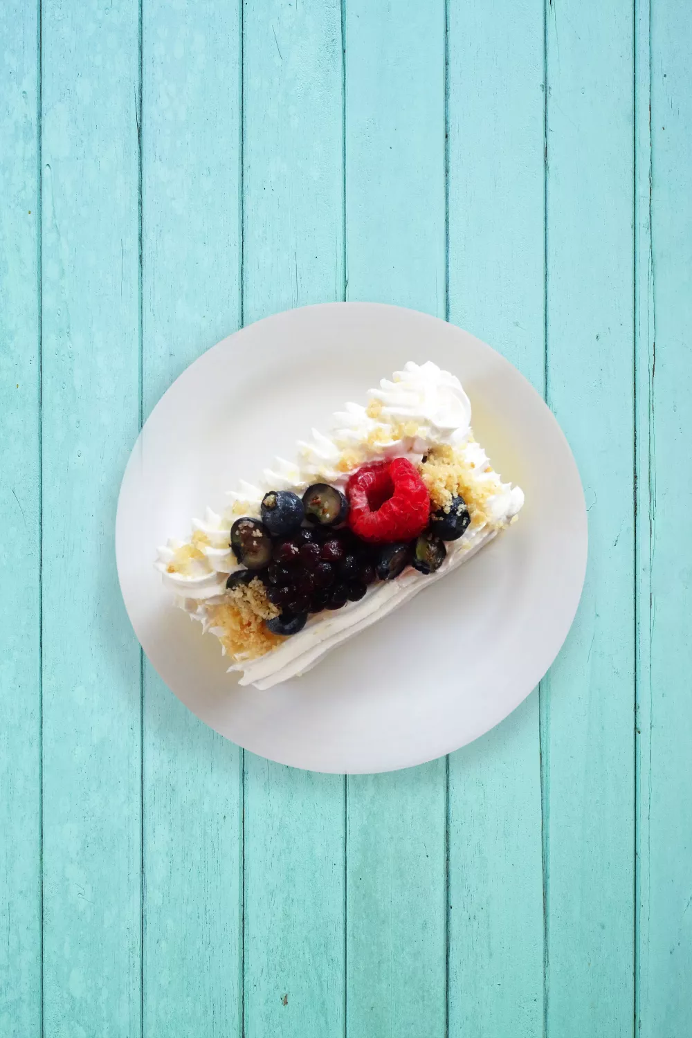 Tot slot werk de cake af met wat vers fruit naar keuze en de crumble van cake.