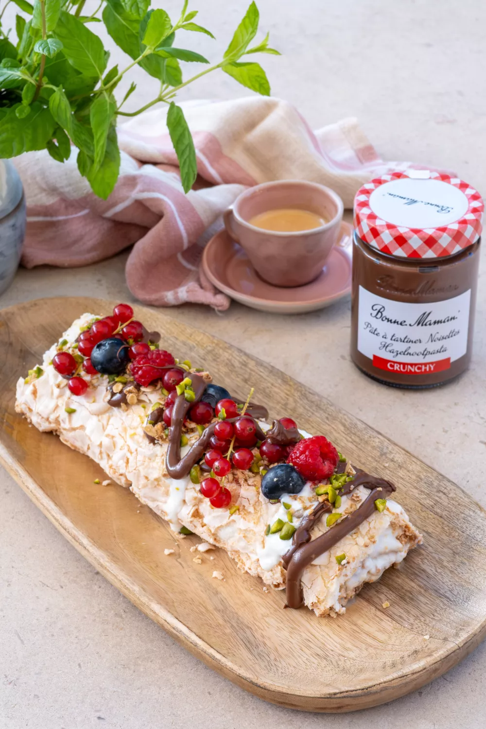 Deze pavlova roll met Bonne Maman crunchy chocopasta is een spectaculair dessert dat er indrukwekkend uitziet, maar verrassend eenvoudig te maken is. De luchtige, krokante meringue met marshmallow-zachte binnenkant vormt de perfecte basis voor een romige laag chocopasta en Griekse yoghurt. Afgewerkt met rood fruit, geroosterde granola, pistachenoten en munt ontstaat een frisse, feestelijke smaakcombinatie die ideaal is voor verjaardagen, feestdagen of een luxueuze weekendtraktatie.