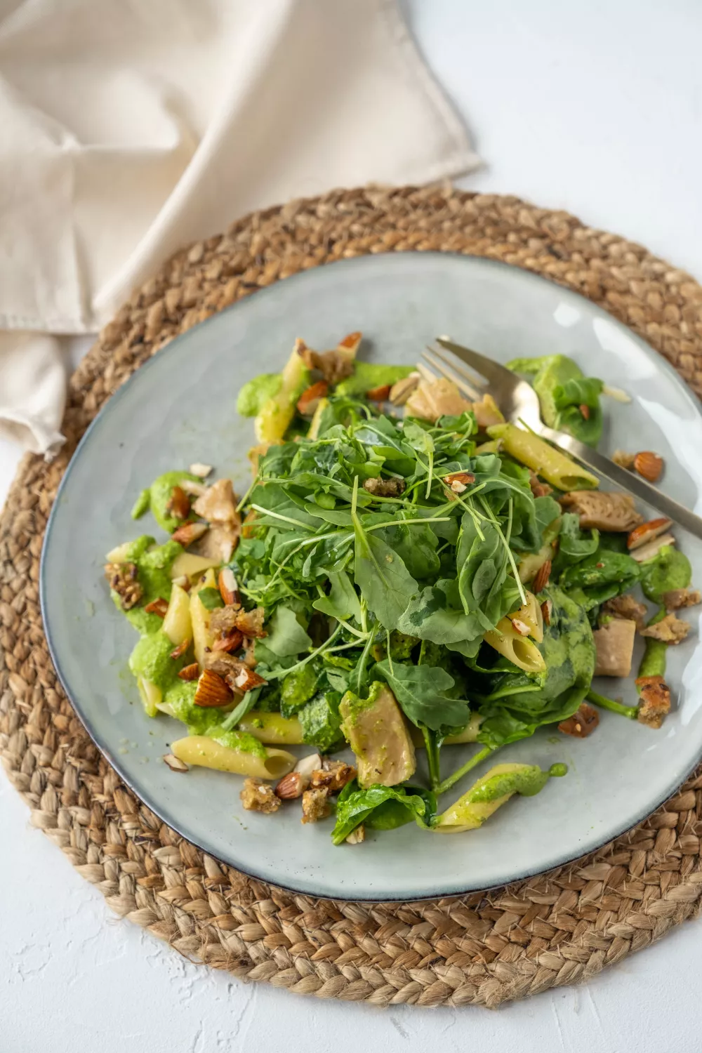 Penne met vegetarische kip en spinaziepesto