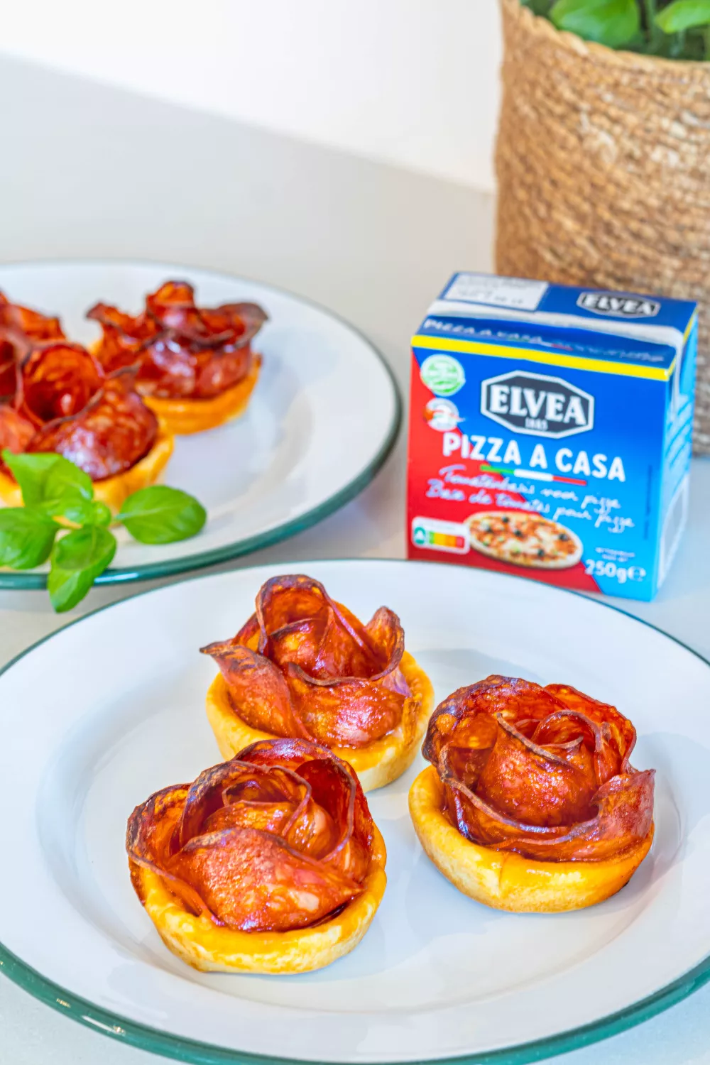 Mini pizza roosjes met pittige chorizo en smeltende mozzarella zijn een onweerstaanbare borrelhap voor feestjes, aperitieven of een warme avond thuis. Met kant-en-klaar pizzadeeg, een lik Elvea pizzasaus en korte voorbak in cupcakevorm zet je in korte tijd hartige fingerfood op tafel. Door de chorizoplakjes tot roosjes te draaien en alles even in de oven te laten garen krijg je krokante, smaakvolle hapjes die er feestelijk uitzien en bij elk seizoen passen.