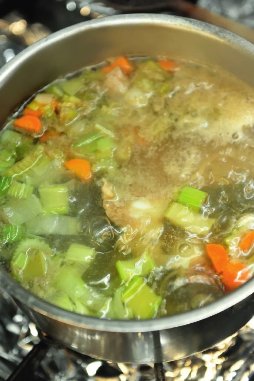Doe de ingrediënten voor de bouillon in een grote kookpot en zet ze net onder water. Voeg een scheutje olijfolie toe en een paar snufjes zout, breng aan de kook en laat ongeveer 90 minuten sudderen op een zacht vuur. Giet de bouillon door een zeef.