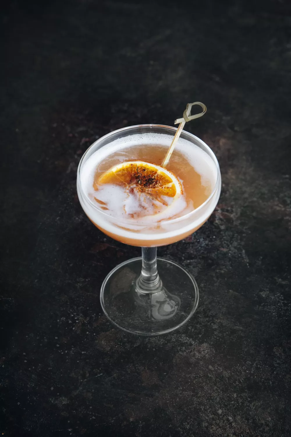 Een tropisch getinte cocktail met Don Papa rum en gerookt kokoswater, waarbij passievrucht en triple sec frisse citrus tonen geven en ingelegde zoetzure rode ui voor een verrassende zoute pit zorgt. Steranijs, venkelbloem en Angostura bitters brengen kruidige diepte en het geheel wordt theatrale afgewerkt met een aangebrand sinaasappelschijfje en een druppel smoky bacon olijfolie. Shake met ijs en zeef in een gekoeld glas voor een opvallend aperitief dat heerlijk combineert met Naan met Belgische geitenkaas en octopus.