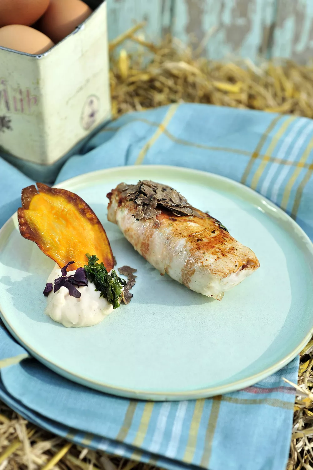 Leg de rolletjes op voorverwarmde borden. Schep er wat van de pastinaakpuree naast en werk af met een chip van zoete aardappel en een salieblaadje. Schaaf er desgewenst nog wat truffel over.
