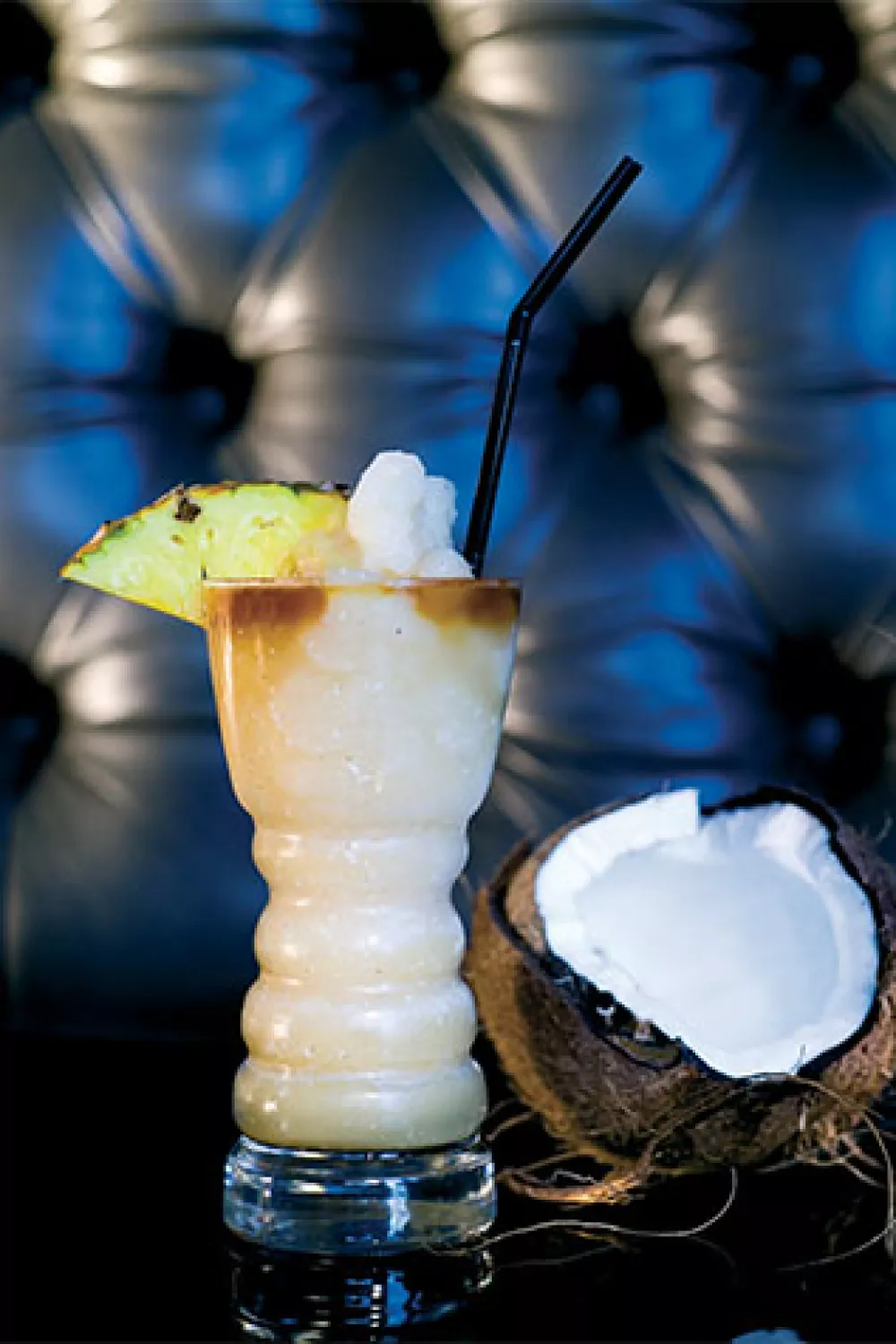 Doe de ananaspartjes samen met het witte kokosnootvlees, het ananassap, de witte rum, coconut cream en het gepileerde ijs in een blender en mix fijn. Doe de cocktail in het glas en top af met een scheutje donkere rum.