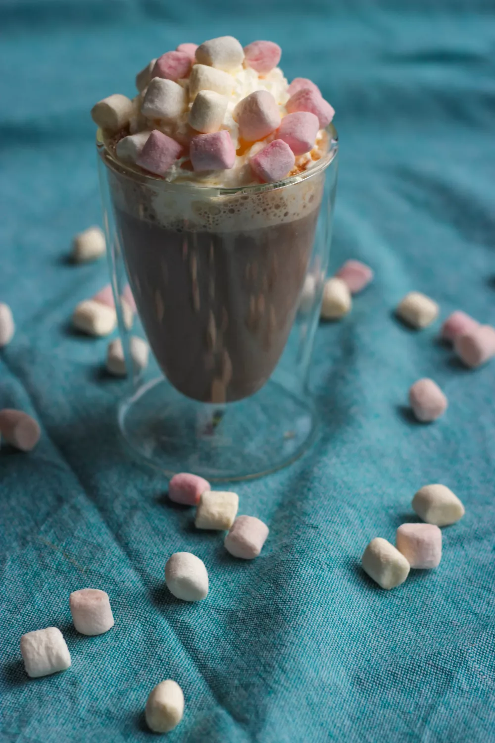Giet de chocolademelk in een glas. Werk af met slagroom en mini-marshmallows.