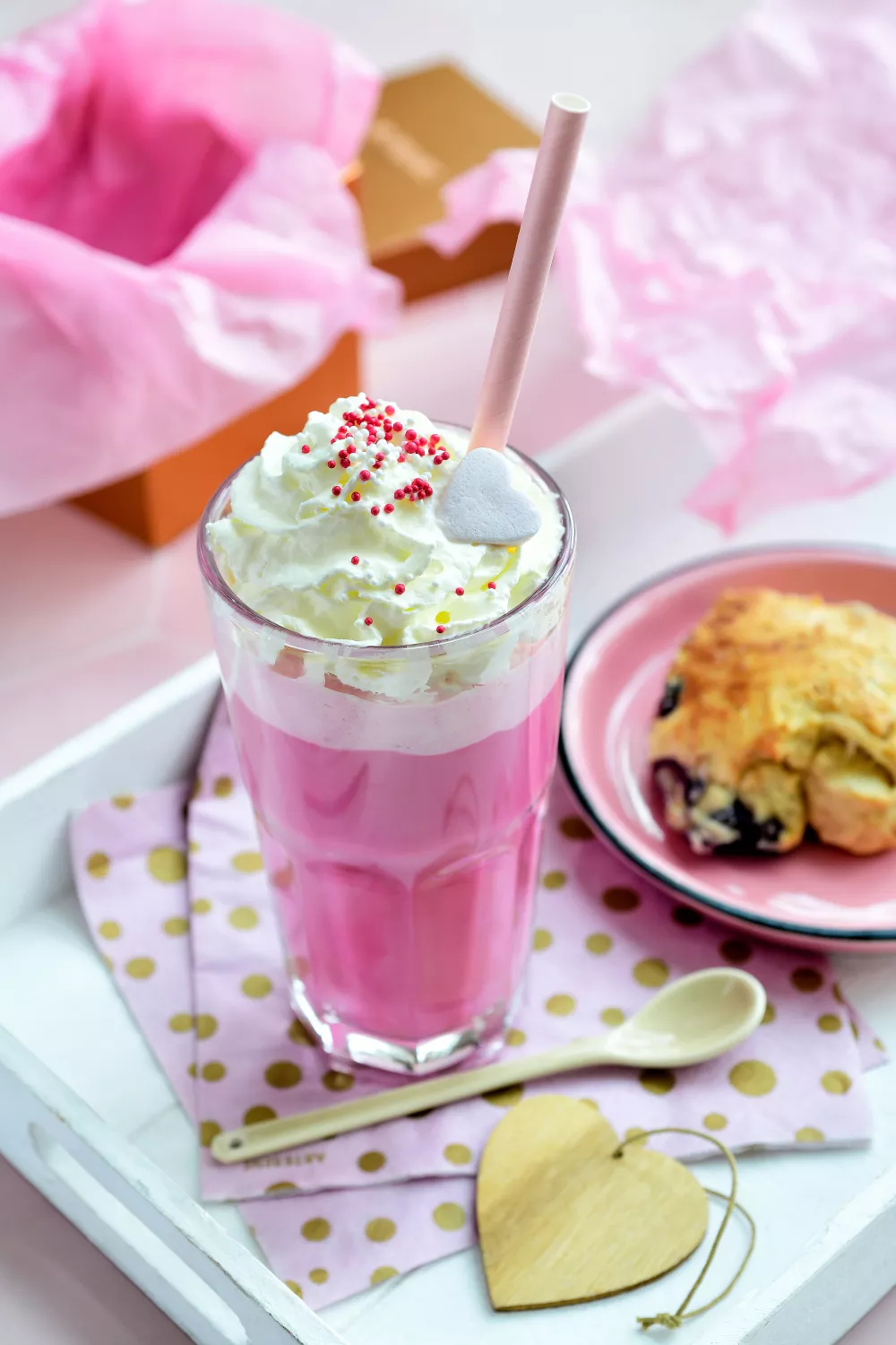 Een zachte roze latte op basis van rode bietensap en warme melk, perfect als feestelijke brunchdrank of fotogenieke valentijnstraktatie. Je verwarmt de melk en roert het bietensap erdoor, klopt romige slagroom met poedersuiker en spuit een toef bovenop voor een speelse, zoete topping met sprinkles. Voor een volwassen twist voeg je per glas een espressoshot toe en serveer je de latte warm bij gezellige winterdagen of als frisse lenteverrassing.