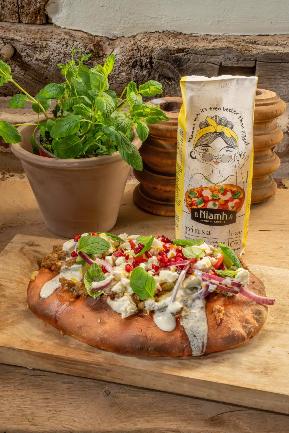 Deze pinsa met lamsgehakt is een heerlijke Mediterrane twist op de klassieke pizza. Het luchtige deeg wordt rijkelijk belegd met gekruid lamsgehakt, frisse yoghurtsaus, knapperige salsa en romige feta. Afgewerkt met granaatappelpitjes en munt voor een kleurrijk en smaakvol resultaat. Perfect voor een speciale lunch of een avondmaal vol smaak en textuur.