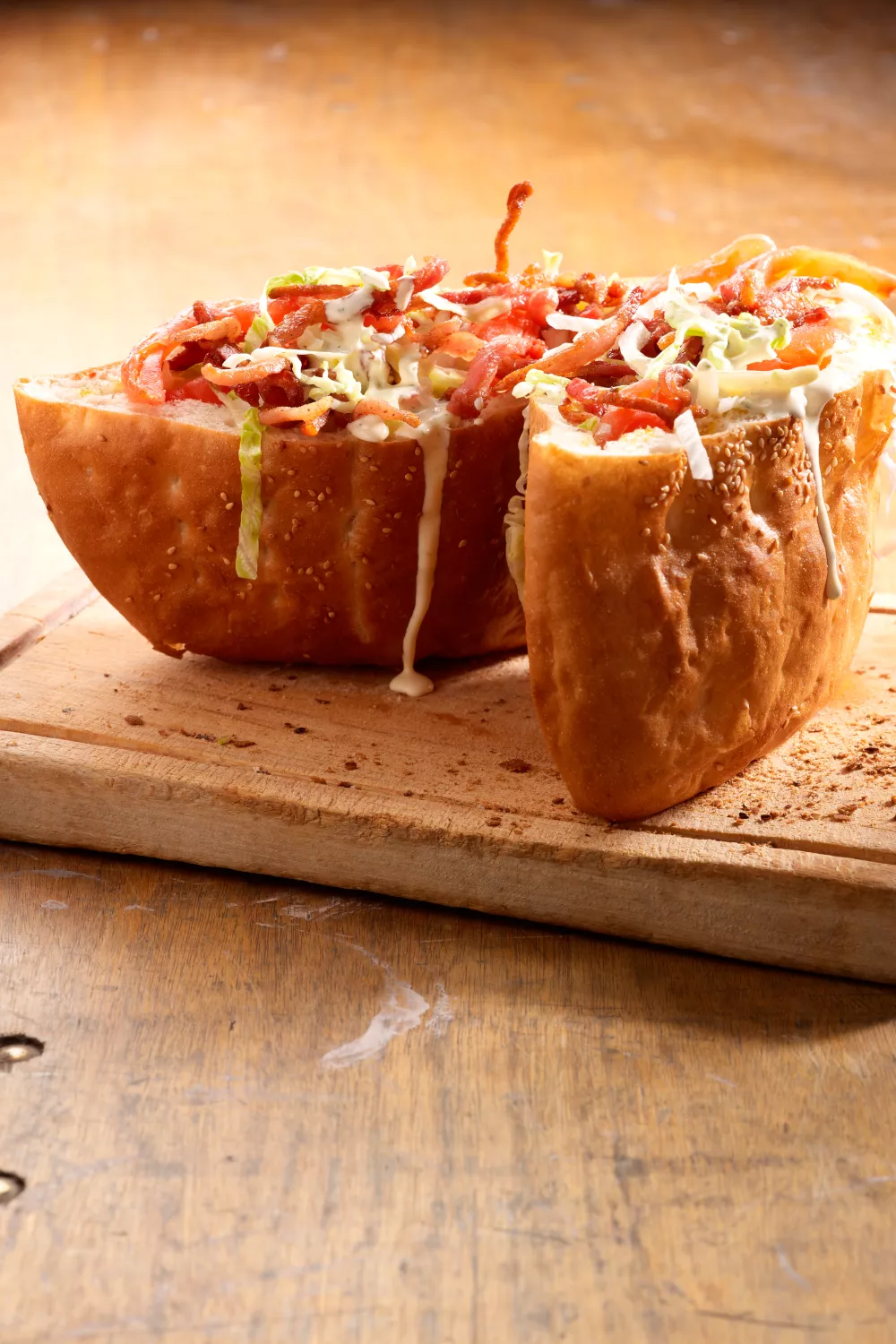 Haal het brood uit de oven, snijd doormidden en smeer de onderste helft in met looksaus. Leg er afwisselend een laag groentjes en vlees op en eindig met de looksaus. Leg de andere helft van het brood erop en druk zachtjes aan.