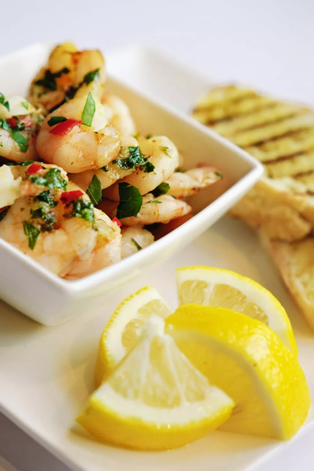 Serveer de gamba’s met partjes citroen en stokbrood.