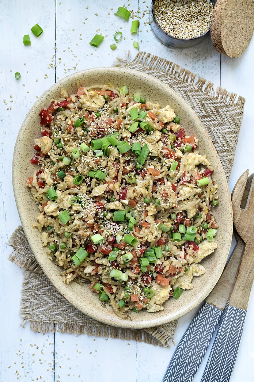 Pittige gebakken bloemkoolrijst boordevol kleurrijke groenten en Aziatische smaken. Bloemkool wordt in de blender tot fijne kruimels verwerkt en kort geroerbakt met wortel, paprika, sojascheuten, ei, sojasaus, oestersaus, sambal en een vleugje sesamolie. Een snelle, lichte doordeweekse maaltijd of voedzame lunch die in één wok klaar is.