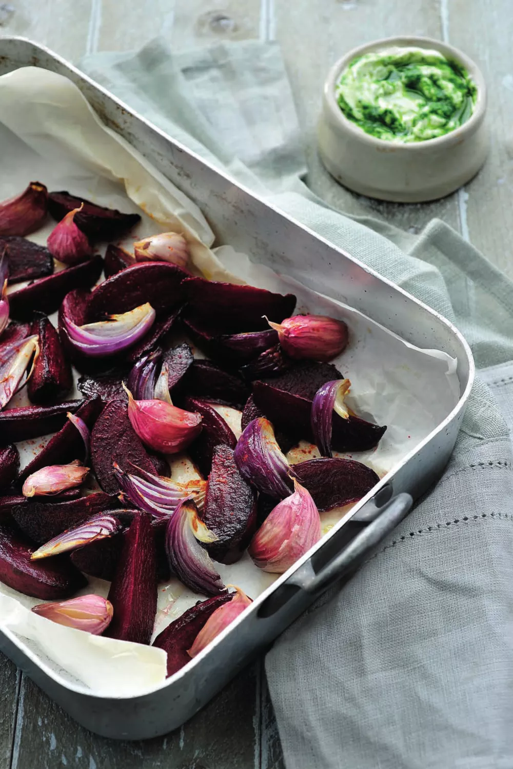 Rode bieten geroosterd met rode ui en knoflook krijgen door Espelette een zachte pittigheid en behouden volop hun zoete diepte. Serveer ze met romige Griekse yoghurt die je opfrist met een muntolie van kort geblancheerde munt en druivenpitolie voor een fris aromatisch contrast. Dit kleurrijke vegetarische bijgerecht past zowel bij een herfstig diner als bij een lichte zomerlunch of borrel.