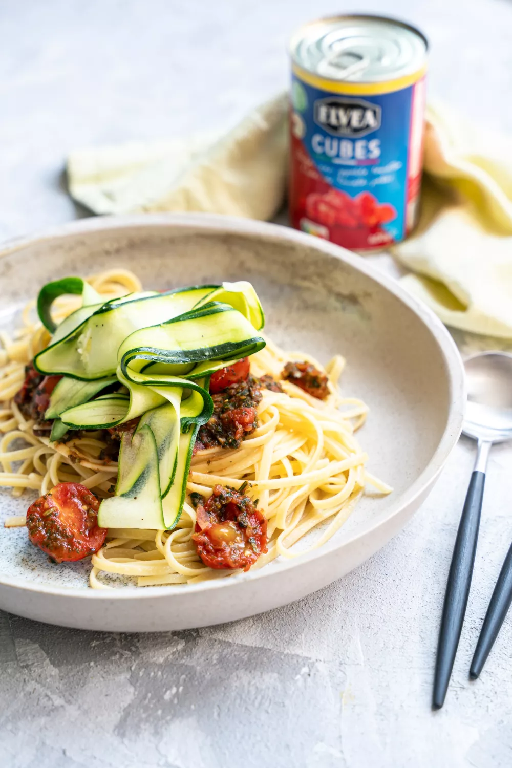 Stappenplan om recept “Pittige pasta met tomaat en courgette” te bereiden