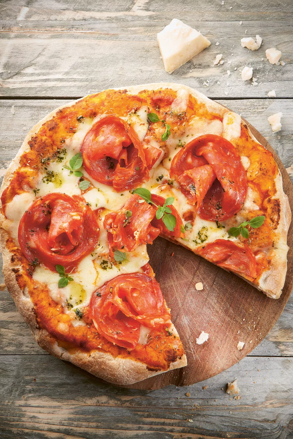 Kneed na het rusten het deeg nog eens heel kort en verdeel het in drie gelijke ballen. Rol het deeg met een deegrol uit op een met bloem bestoven oppervlak tot de juiste grootte en dikte. Denk eraan om de ovenplaat goed met olijfolie in te strijken voor je de pizzabodem erop legt.