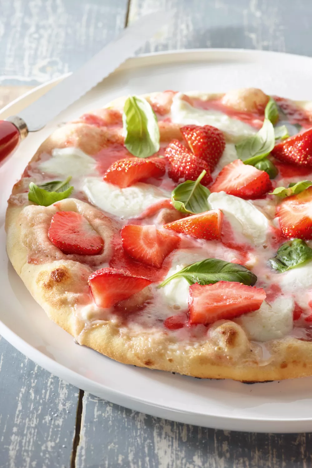 Zomerse pizza met aardbeien, mascarpone en confituur combineert frisse fruitigheid met romige zoetheid op een dunne krokante bodem. Zacht basilicum en smeltende mozzarella geven een verrassende hartige toets, ideaal als origineel dessert of lichte lunch bij warm weer. Het zelfgemaakte deeg rol je dun uit en bak je in een zeer hete oven tot de korst goudbruin is.
