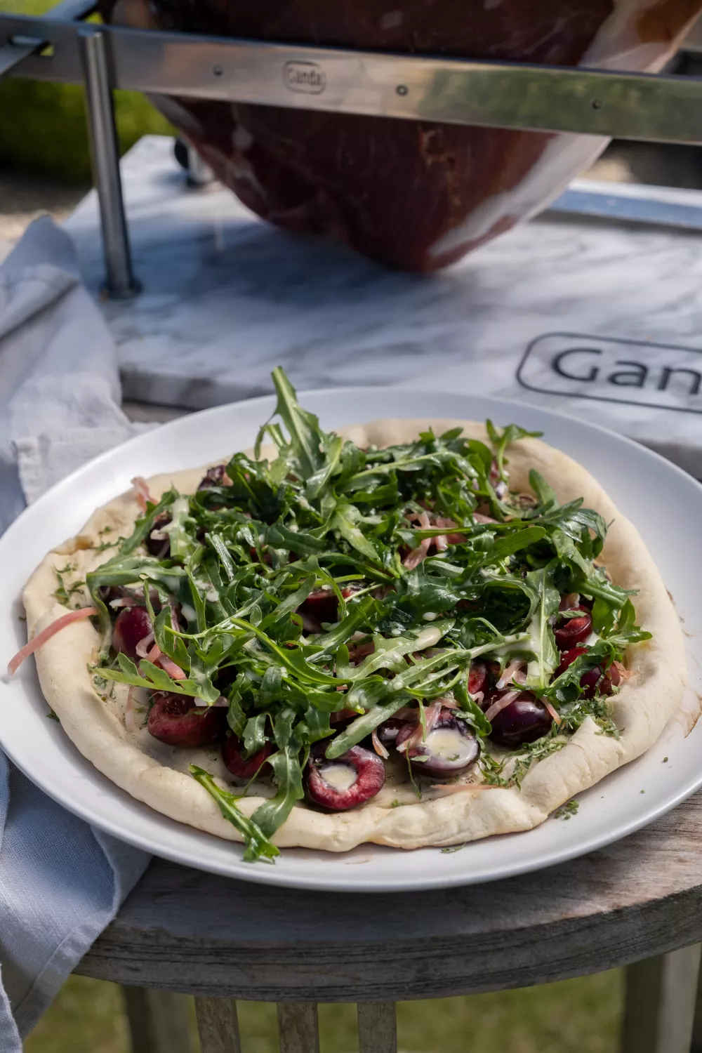Bak ondertussen de pizza’s op een pizzasteen op de barbecue (+- 10 minuten). Meng de rucola met een scheutje olijfolie en een scheutje rode wijnazijn. Haal de pizza van de barbecue en beleg met kersen, sneetjes Gandaham, rucola en verse oregano. Werk af met het sausje van Stilton.