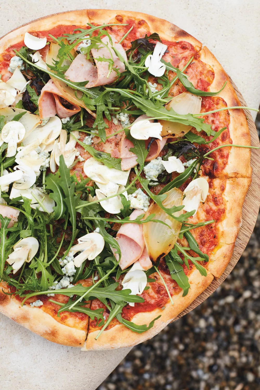 Deze pizza op de barbecue combineert een krokant zelfgemaakt deeg van 00 bloem en fijn griesmeel met een rijke, langzaam geroosterde tomatensaus op olijfoliebasis. Met toppings als ham, gorgonzola, zongedroogde tomaat en champignon en aroma's van knoflook, basilicum en rozemarijn krijgt hij een hartige, Mediterrane smaak. Bakken op een pizzasteen in de barbecue geeft knapperige randen en een rokerig accent, ideaal voor zomerse buitenmaaltijden met vrienden.