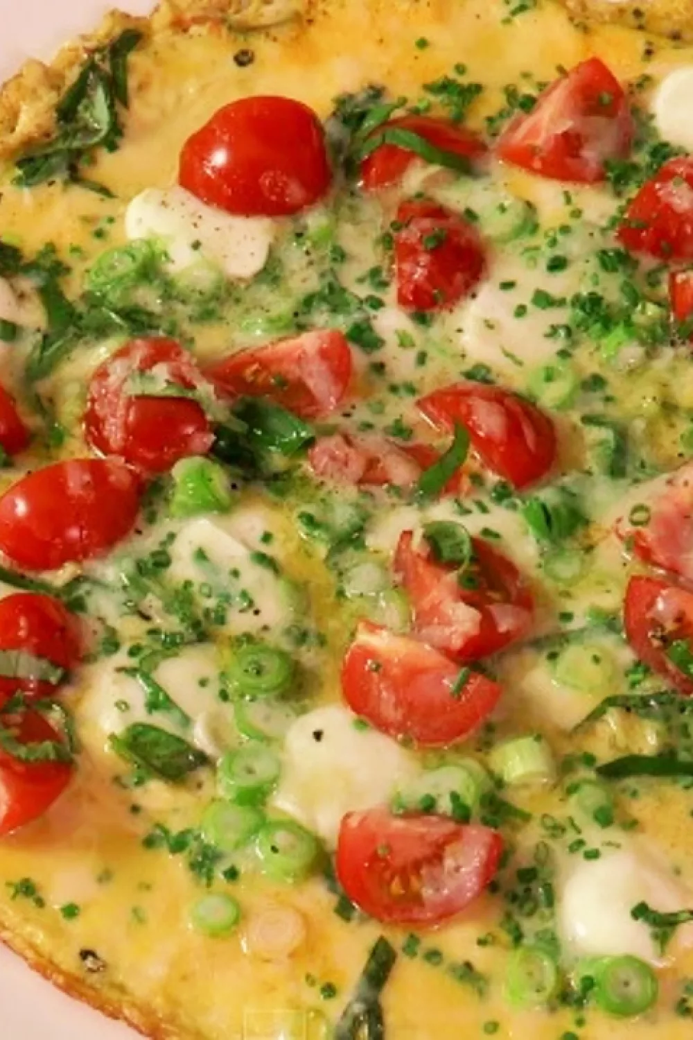 Deze luchtige pizza van ei combineert romige mozzarella en zoete kerstomaatjes met frisse basilicum voor een zomerse, lichte brunch of snel ontbijt. Door de eieren los te kloppen met melk en zacht te stollen in de pan ontstaat een fluweelzachte omeletbodem die rijk wordt belegd met bieslook, lente-ui en geraspte kaas. Klaar in enkele minuten en perfect voor een ontspannen weekendlunch of doordeweeks ontbijt.