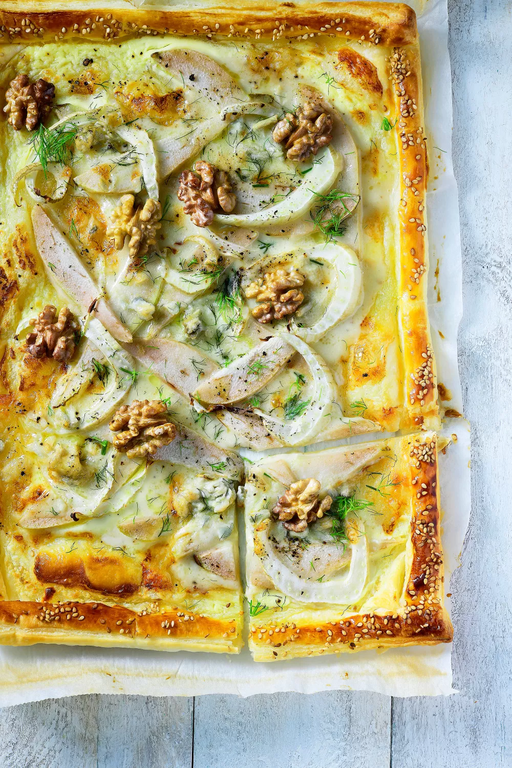Plaattaart met blauwe kaas, venkel, peer en walnoten