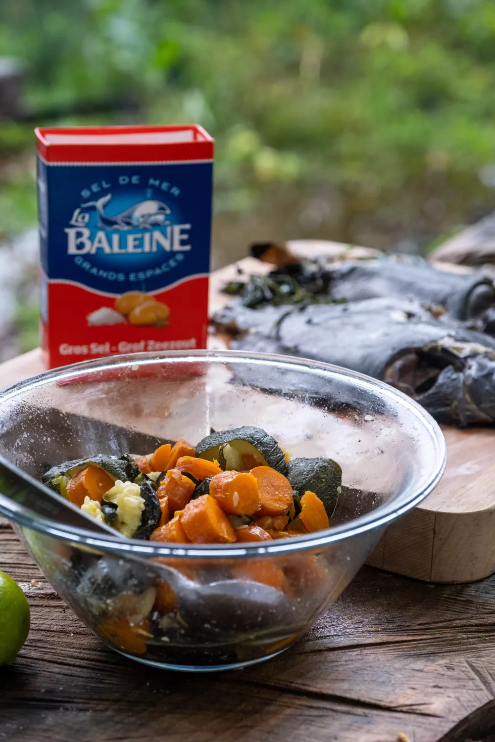 Klop de eiwitten los in een grote kom. Voeg er het zout en een scheutje water aan toe. Meng goed. Neem zilvepapier, leg er telkens een laagje van het zoutmengsel op en dan een groentje (wortel, courgette, aubergine, … ). Bedek opnieuw met een laagje van het zoutmengsel en pak stevig in. Laat de groenten ongeveer 30 minuten garen op de barbecue/open vuur. Haal de groentjes van het vuur en laat ze nog in het zilverpapier zitten tot de vis klaar is.