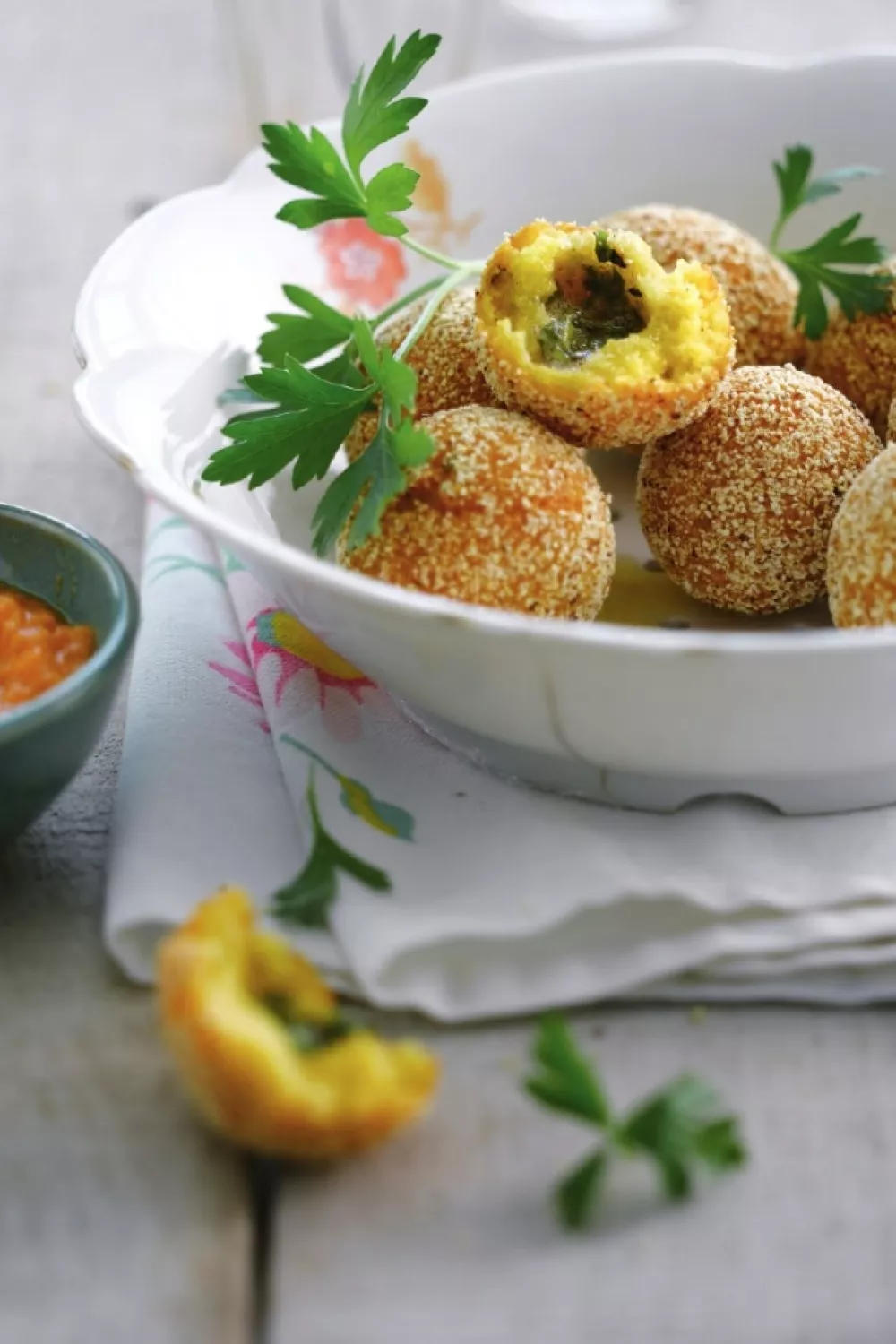 Sluit opnieuw tot een mooi balletje en rol nog even door de polenta. Bak de bolletjes in frituuroliegoudbruin.