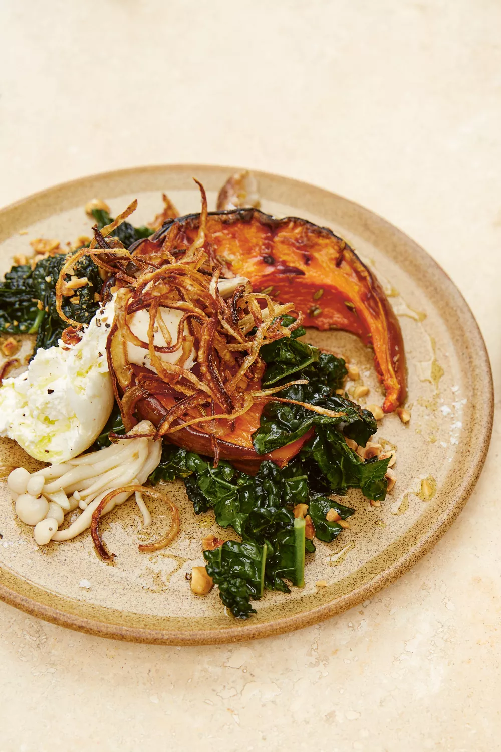 Zachtzoete pompoen met warme tonen van komijn en venkel ontmoet romige burrata en knapperige cavolo nero voor een verfijnd samenspel van textuur en smaak. De pompoen wordt langzaam geroosterd, uien krokant gebakken en de bladgroente zacht gemasseerd met citroen en olijfolie, ideaal voor herfstige diners of een opvallend vegetarisch voorgerecht. Werk af met geroosterde hazelnoten en een scheut extra vierge olijfolie.