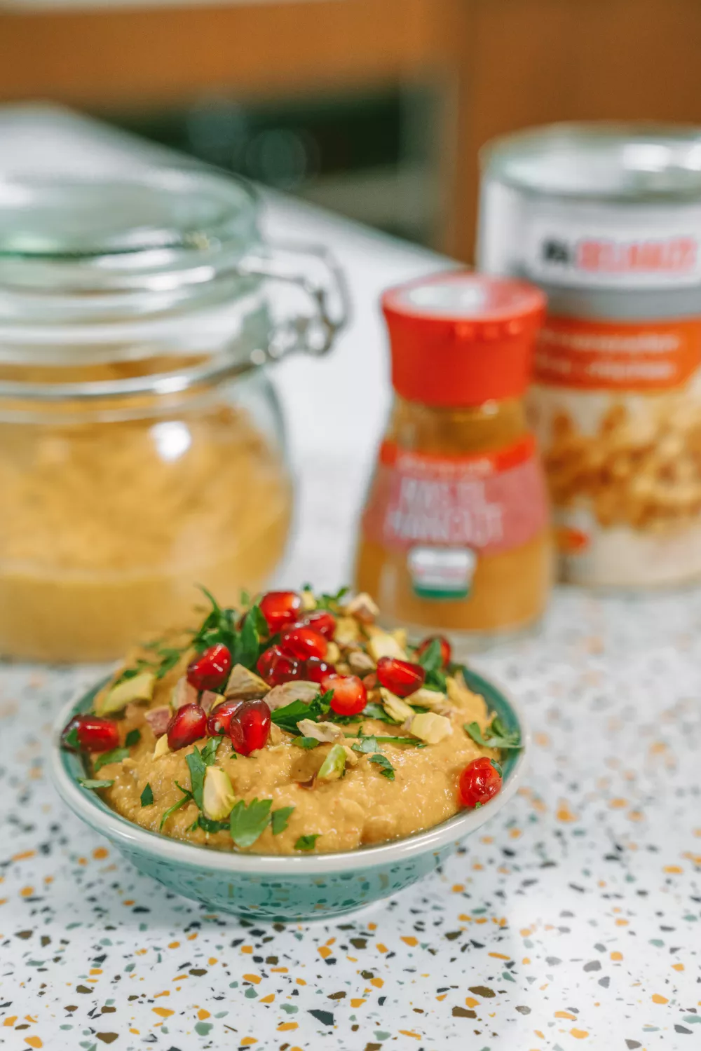 Serveer de hummus in een kommetje en werk af met de bladpeterselie, pistachenoten en granaatappelpitjes.