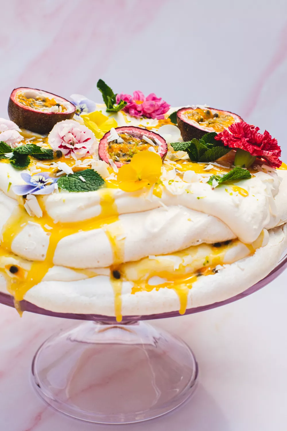 Versier de pavlova met de halve passievruchten, eetbare bloemen, munt, witte chocolade en limoenrasp.