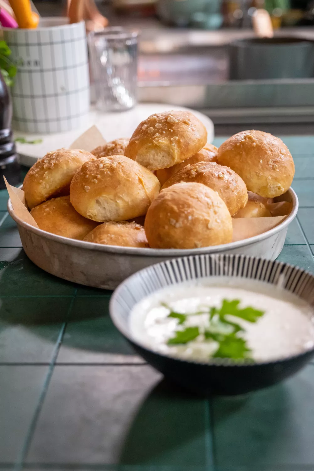 Meng alle ingrediënten voor het deeg in een kom tot één massa. Schep het deeg in de keukenrobot (met deegarm). Kneed tot het glad en elastisch is, op lage stand, ongeveer 10-12 minuten. Deeg moet de ruittest doorstaan. Scheur een klein stukje van het deeg en stretch uit in vier richtingen. Je moet kunnen uitrekken zonder dat het stukgaat. Scheurt het tocht? Dan moet het deeg nog verder gekneed worden. Leg het deeg op het aanrecht en vorm het tot een gladde bal. Schraap de restjes uit de mengkom. Voeg wat olie toe aan de kom. Gebruik deeg om de olie rond te wervelen en de deegbal zelf te bedekken. Dek af en laat ongeveer 60 à 70 minuten rijzen, totdat het volume verdubbeld is. Draai uit en druk eventuele lucht eruit. Plooi het deeg 3 x langs de lange kant & 3 x langs de korte kant – maak plat, en steek bolletjes uit met een champagneglas. Vorm 24 strakke balletjes. Druk elke deegbal lichtjes plat. Leg ze op een beklede bakplaat, met een tussenruimte van 5 cm. Dek af en laat rijzen tot het in volume verdubbeld is, dit duurt ongeveer , 1-1,5 uur.