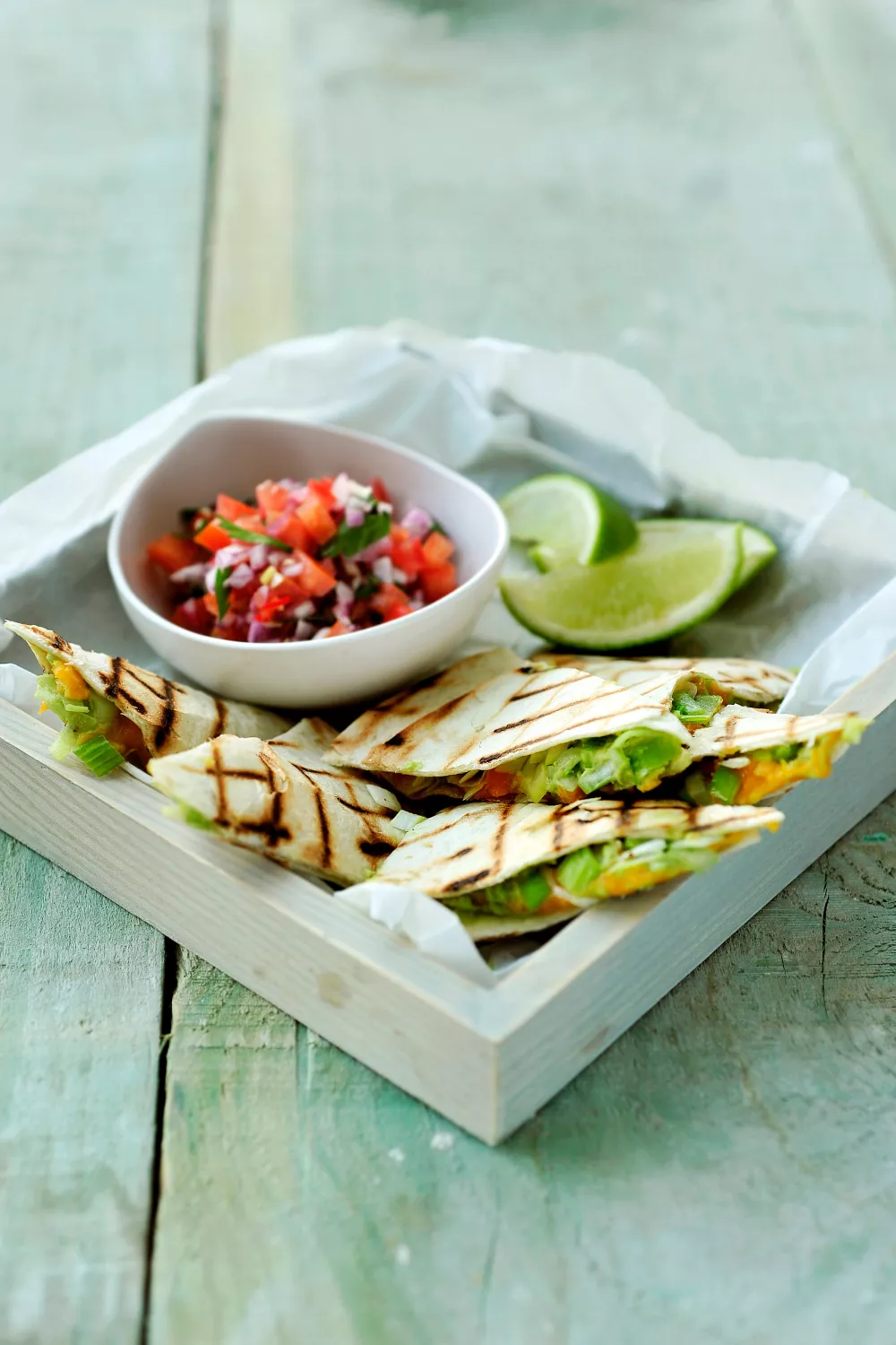 Snijd de quesadilla’s in vieren en serveer met de zure room, de tomatensalsa en enkele limoenpartjes.