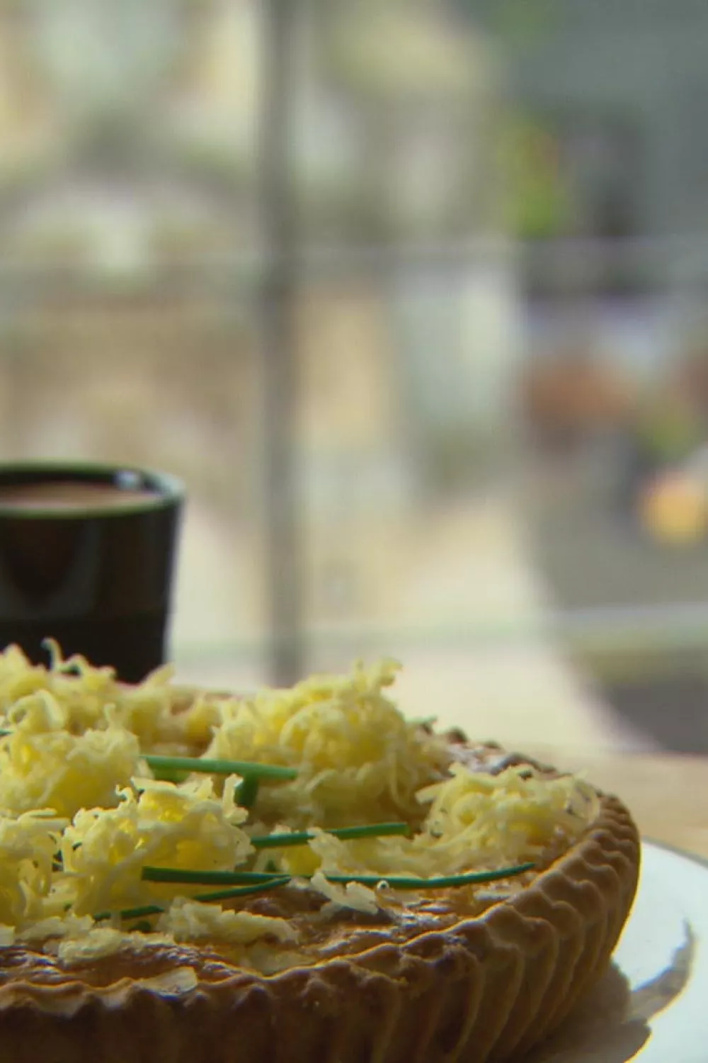 Haal de quiche uit de oven. Werk af met extra fijngehakte walnoten, wat gemalen kaas en enkele takjes bieslook.
