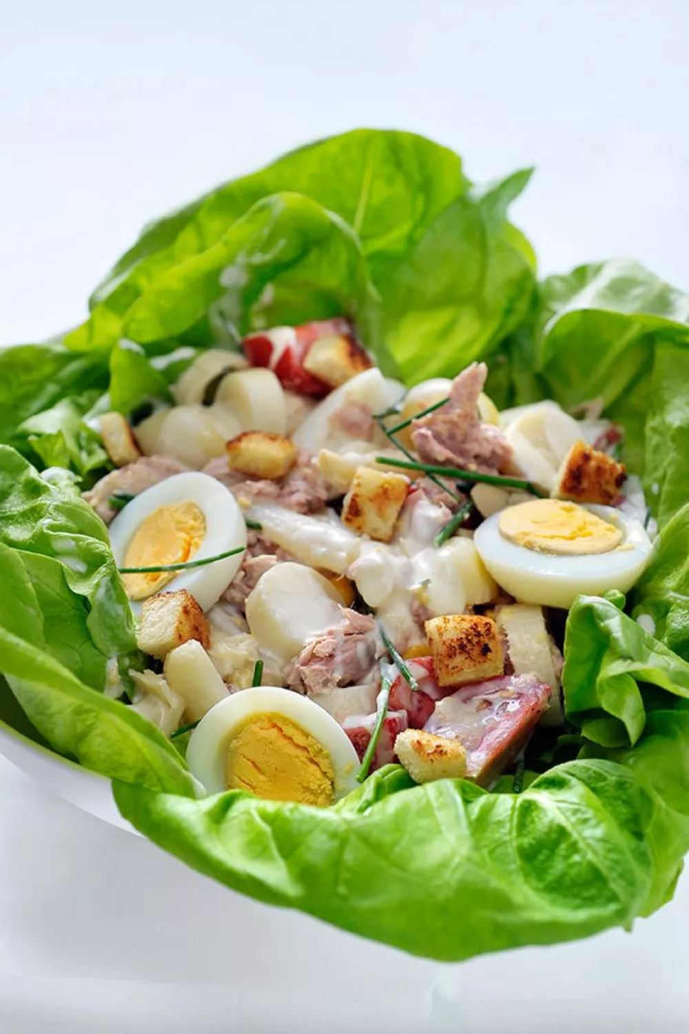 Schep de salade in het mandje kropsla en werk af met de doormidden gesneden eitjes.