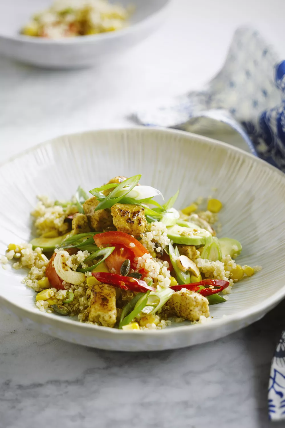 Frisse quinoa met een Mexicaanse toets van tacokruiden, maïs en romige avocado vormt een kleurrijke, voedzame salade die perfect is als zomerse lunch of snel doordeweeks avondmaal. De quinoa wordt zacht gekookt met laurier en de quornblokjes worden goudbruin gebakken voor extra bite. Afgewerkt met limoensap en geroosterde cashewnoten en pompoenpitten voor een knapperige finish.