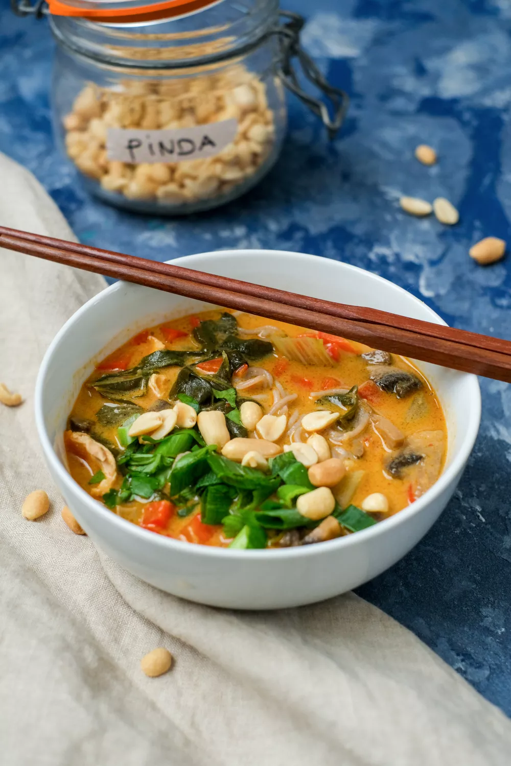 Verwarm op een zacht vuurtje de kippenbouillon in een grote soeppot. Voeg er vervolgens de kokosmelk, tamari, ahorn, pindapasta en rode curry aan toe.