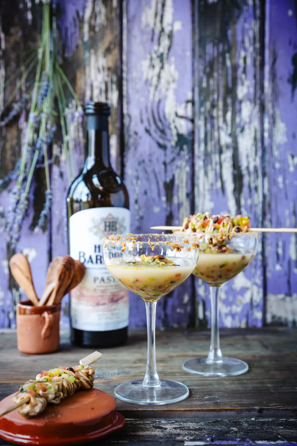 Zomerse ratatouille met Zeeuwse mosselen en pittige currypasta vult elegante brochettes en een smaakvolle cocktail van mosselkookvocht en pastis. Gegrilde paprika's, courgette en tomaat krijgen meer diepte door het vel te blussen en te roosteren, terwijl mosselen kort stomen in witte wijn hun sap vrijgeven voor een aromatische bouillon. Voor gevorderden geeft een krokant tempurajasje de brochettes een feestelijk contrast.