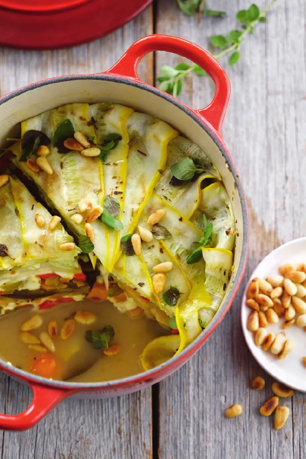 Een kleurrijke Provençaalse ratatouille in laagjes brengt zachte aubergine, sappige courgette en zoete paprika samen met gesmolten mozzarella voor een zomerse mediterrane smaaksensatie. Het gerecht wordt laag voor laag opgebouwd en zachtjes gestoofd au bain marie zodat de groenten hun aroma en sap behouden. Serveer warm als licht hoofdgerecht of als bijgerecht bij vis of vlees, afgewerkt met geroosterde pijnboompitten en verse oregano.