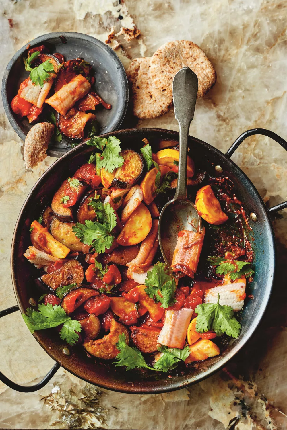 Deze robuuste ratatouille combineert zomerse aubergine, courgette en tomaat met de rokerige diepte van gerookte paling voor een verrassend rijk eenpansgerecht. Ras el hanout en harissa geven kruidige warmte terwijl je de groenten kort aanbakt en vervolgens zacht laat stoven in tomatenblokjes voor een smeuïge textuur. Perfect als feestelijk hoofdgerecht of hartig bijgerecht bij een zomerse borrel, afgewerkt met verse koriander voor een frisse toets.